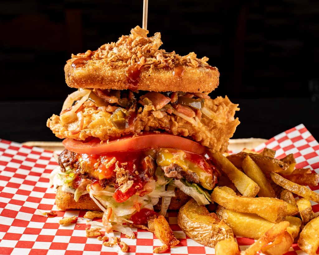 Relish jalapeño con bacon troceado, crunchy, pollo en tempura, tomate, mermelada pimientos rojos, carne, cheddar lonchas ,lechuga, salsa finas hierbas y por último tapa de queso rebozadoSalsa